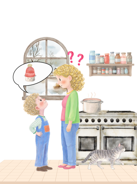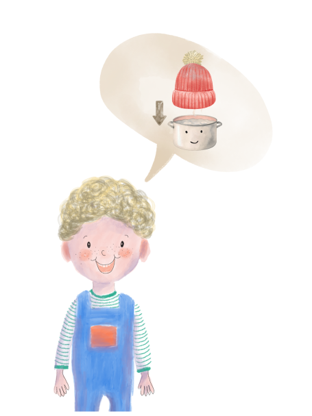 Leon möchte nach draußen gehen und sagt zu seiner Mutter: "Ich setze eine Wollmütze auf den Topf!"